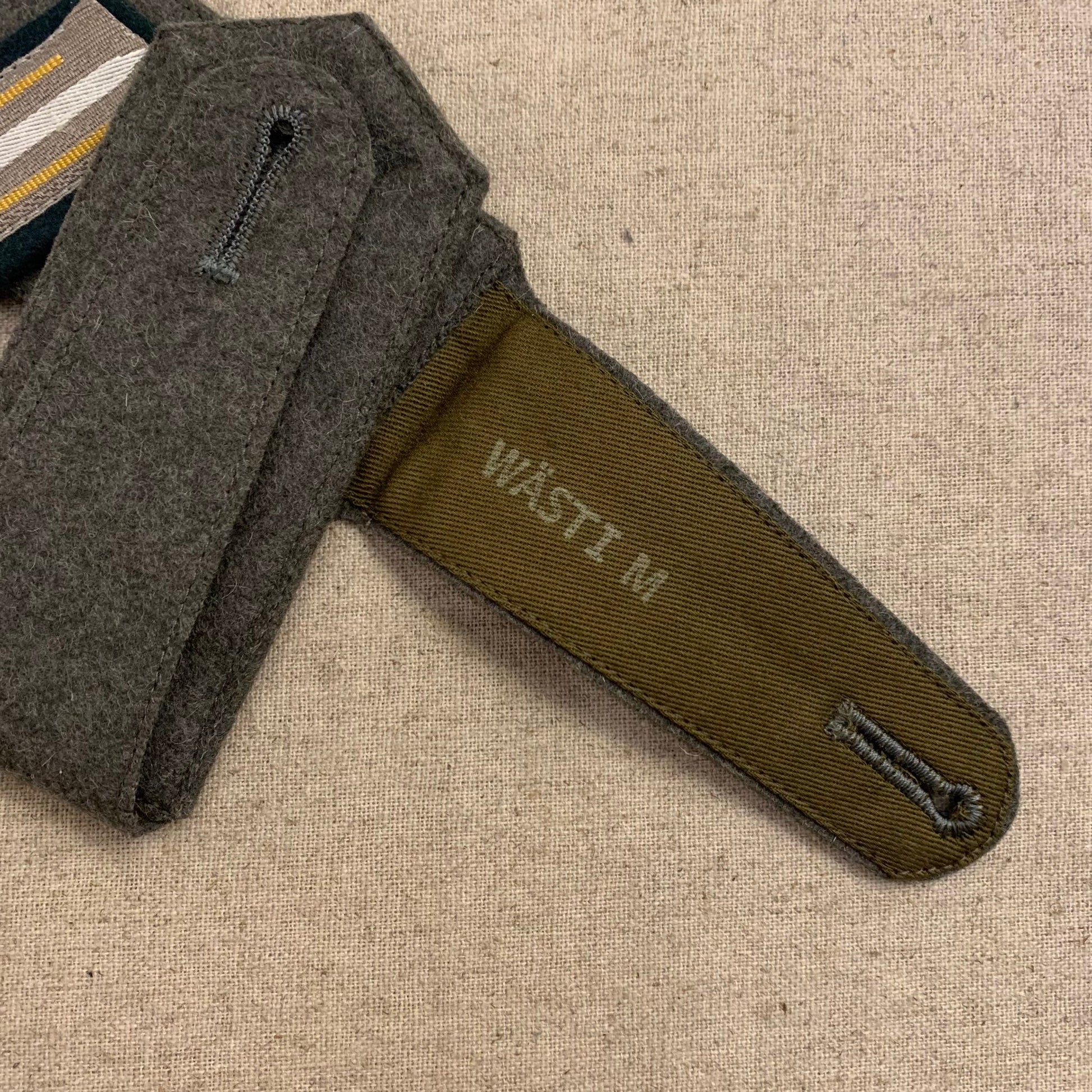 Machine embroidered type, with WÄSTI mark on the tongue, which means Wäschestickerei (linen embroidery).
