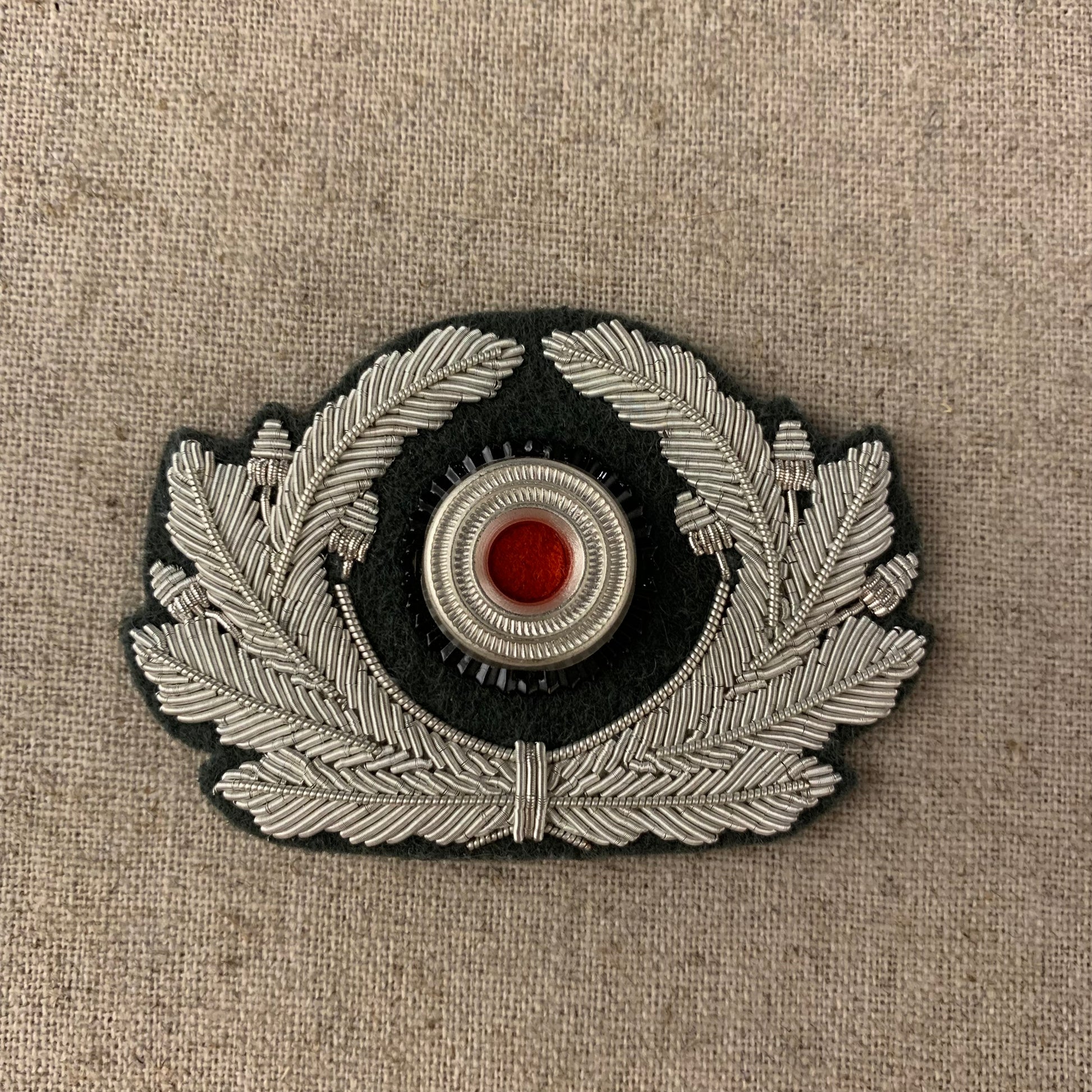 Hand embroidered first pattern wreath on Reseda wool backing, with early type flat metal cockade.