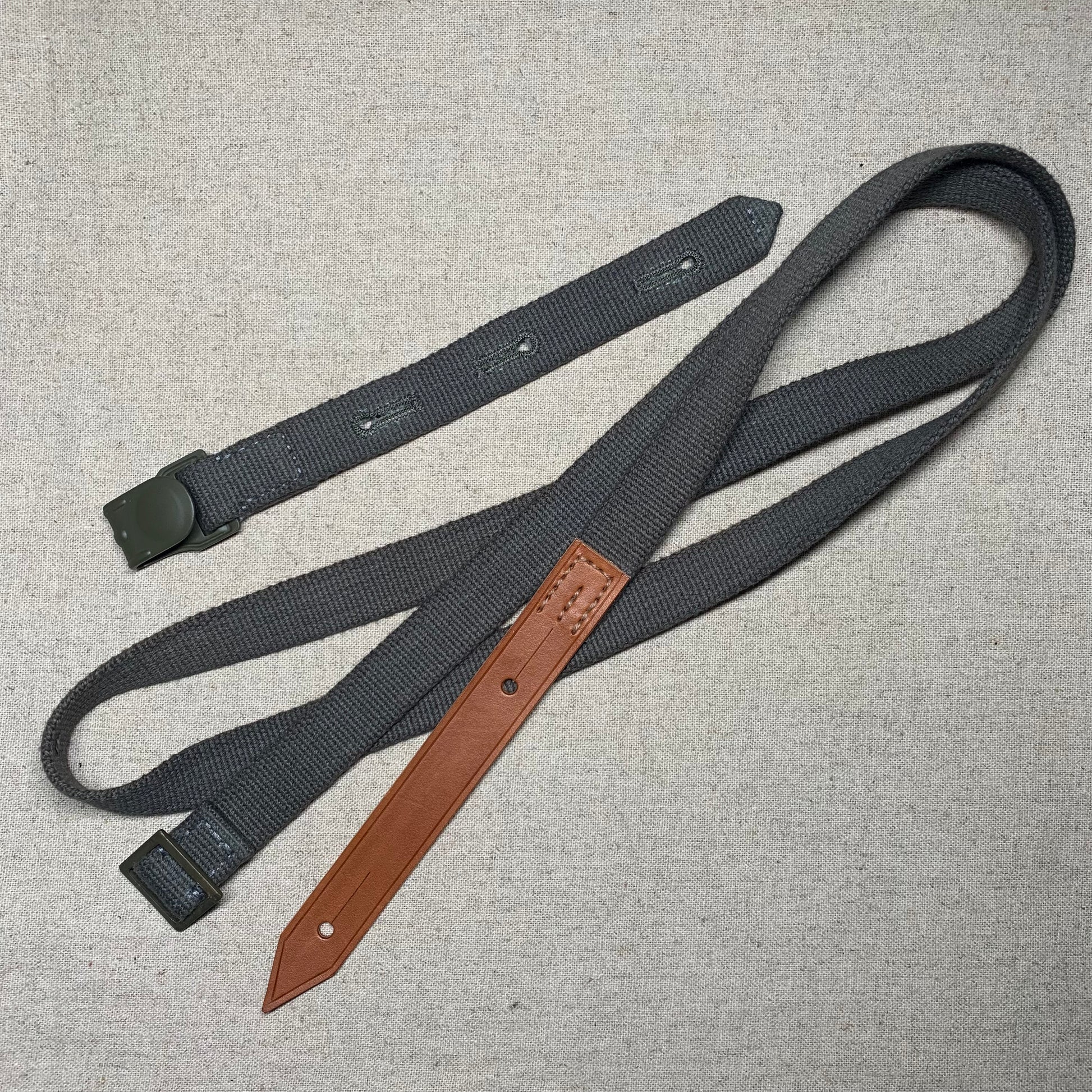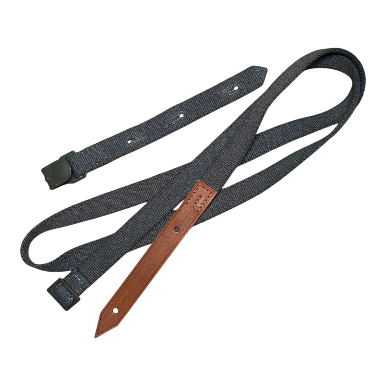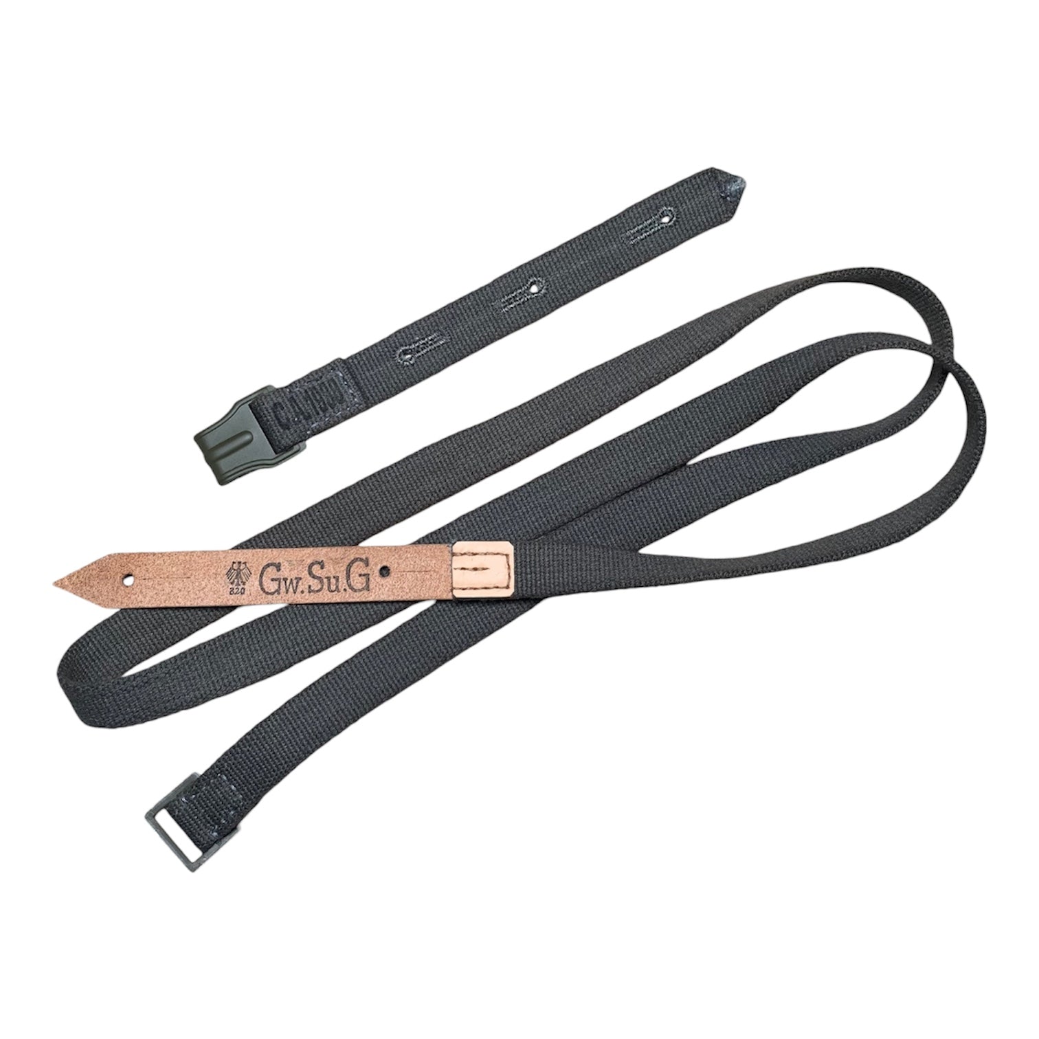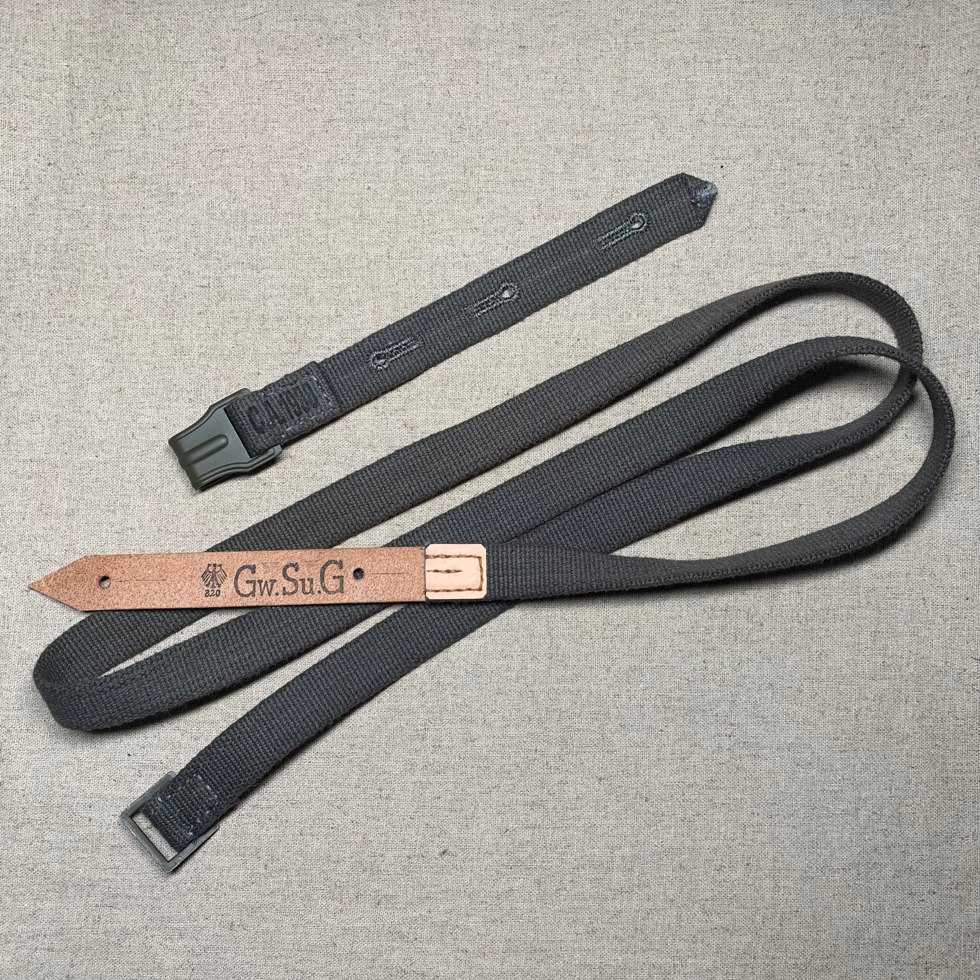 Early blue-grey cotton webbing, the short strap with original hook ( repainted to pre-war Feldgrau ), the long strap with leather ended, both straps have oil ink marks, just like the originals.